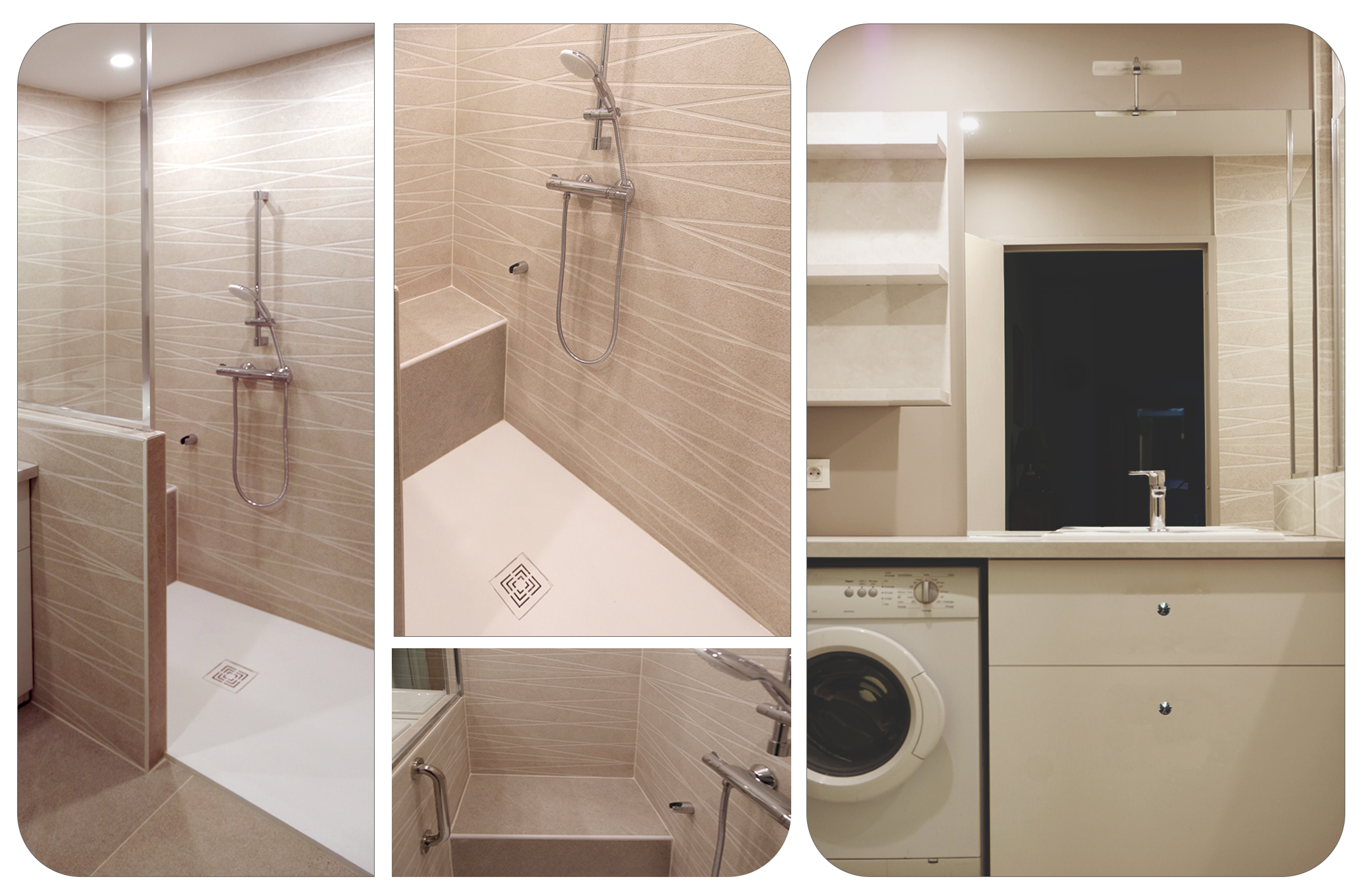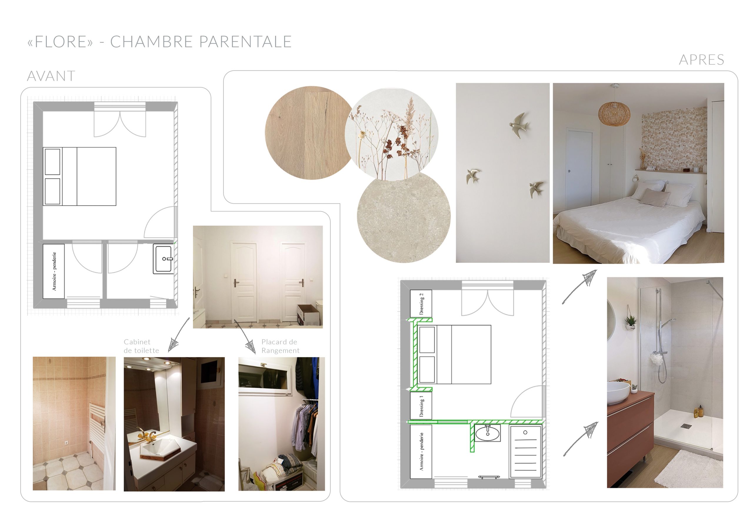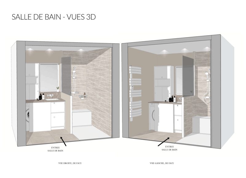Les volumes et les circulations sont repensés afin de créer un espace douche et de nouveaux rangements (dressing). Les fonctionnalités sont réparties afin de maximiser l’accès à la lumière naturelle. D’abord une zone d’entrée, avec un dressing, la porte miroir agrandissant la sensation d’espace. Puis, une zone de bain, avec une douche spacieuse (L160 x 90 cm) et un meuble-vasque. Dans la chambre, deux grands dressings sont dessinés et répartis de chaque côté du lit. Une tête de lit est dessinée et recouverte en partie haute de papier peint. Au sol, l’ancien carrelage est recouvert de revêtement stratifié aux propriétés hydrofuges (CoretecR)