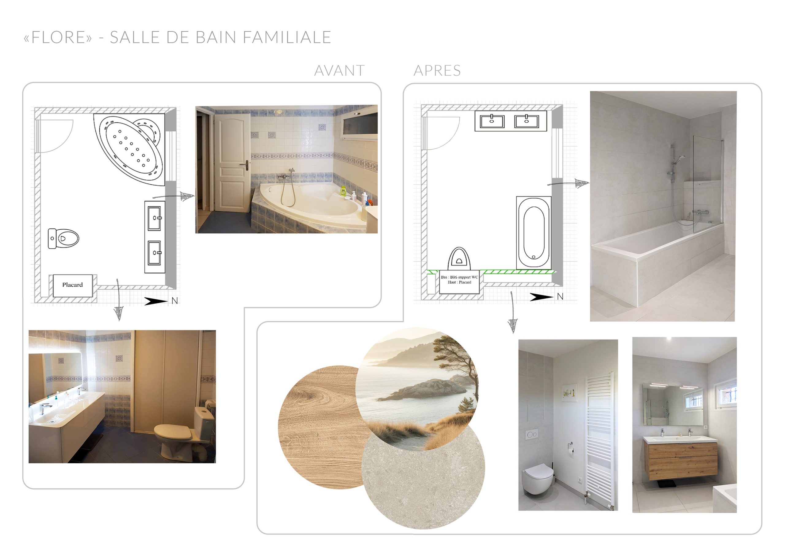La salle de bain est complètement redessinée. La baignoire est choisie de forme droite et accueille un espace douche. Un placard accueille désormais le bâti-support d’un toilette suspendu. Un espace de rangement est conservé, pour y accueillir le linge de toilette, la pharmacie. Le lavabo double-vasque est placé sous l’entrée de lumière naturelle.