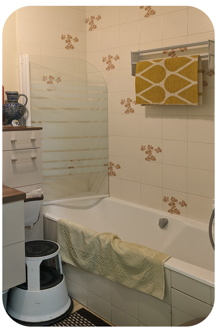A l’origine, la maison ne dispose que d’une seule salle de bain. Située en demi-étage, à côté des chambres des enfants, elle est équipée d’une baignoire d’angle, d’un lavabo, d’un toilette. Promesse d’embouteillages et de frictions familiales liées à son occupation quotidienne, la salle de bain ne répond pas aux attentes et au mode de vie de mes clients.