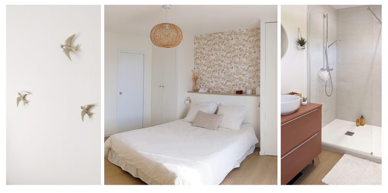 Les volumes et les circulations sont repensés afin de créer un espace douche et de nouveaux rangements (dressing). Les fonctionnalités sont réparties afin de maximiser l’accès à la lumière naturelle. D’abord une zone d’entrée, avec un dressing, la porte miroir agrandissant la sensation d’espace. Puis, une zone de bain, avec une douche spacieuse (L160 x 90 cm) et un meuble-vasque. Dans la chambre, deux grands dressings sont dessinés et répartis de chaque côté du lit. Une tête de lit est dessinée et recouverte en partie haute de papier peint. Au sol, l’ancien carrelage est recouvert de revêtement stratifié aux propriétés hydrofuges (CoretecR)